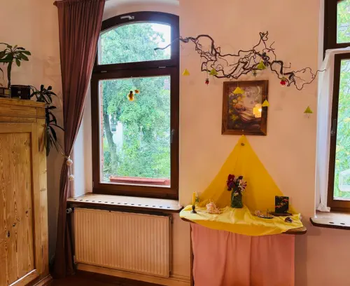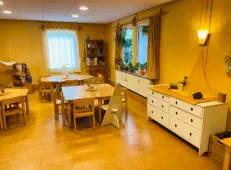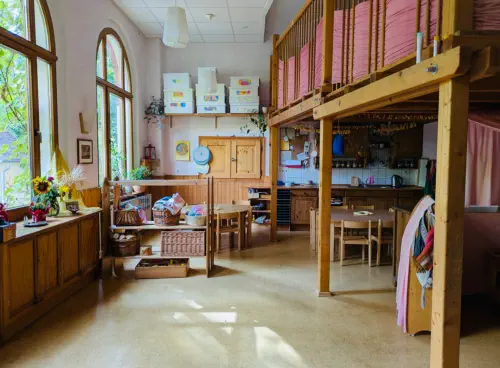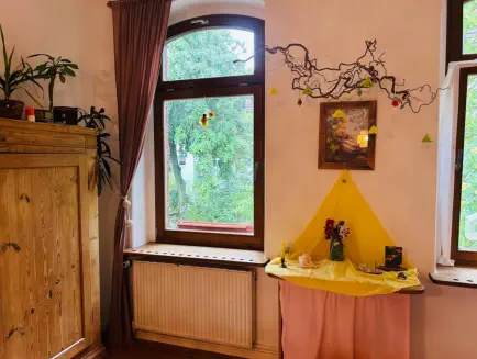 KINDERGARTEN "LINDENBLÜTE"In der Lauchstädter Str. 28 nahm die Kindergartenarbeit 1991 ihren Anfang. Das Haus beherbergt 4 Gruppen mit je 14 - 21 Kindern, was je nach alter der Kinder variiren kann. Die 1 1/2 - bis 3jährigen Kinder haben einen eigenen Bereich in der Kleinkindgruppe. Zu unserem Kindergarten gehört auch unsere Töpferei, in der die Vorschulkinder plastizieren und ein Teil unseres Geschirrs hergestellt wird. Ein Saal steht u.a. für kulturelle Veranstaltungen, Eurythmie und zur Nutzung für Eltern aus unserem Verein zur Verfügung. In unserer Vollwertküche im Erdgeschoss wird das vegetarische und gesunde Essen für alle Kinder und Mitarbeiter*innen gekocht. Hier erleben die Kinder somit auch die Zubereitung und den Duft des Essens sowie die Zusammenarbeit mit unserem freundlichen Küchenpersonal.
