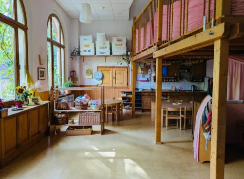 KINDERGARTEN "ALTE FÄHRE"Im Saalekreis zwischen den Städten Halle und Merseburg entstand im Jahr 2008 ein Waldorfkindergarten mit zunächst zwei Gruppen für Kinder ab einem Jahr bis Schuleintritt. Im Jahr 2020 wurde das Außengelände komplett erneuert und der Kindergarten weiter ausgebaut, so kam eine Gruppe dazu. Die nun 40 Kinder werden in einer “Wiegestube”(1-3 Jahre) , einer altersgemischten Gruppe(3-6/7 Jahre) und einer Familiengruppe(2-6/7 Jahre)betreut. Der Kindergarten hat eine gute Verkehrsanbindung und liegt im Grünen, direkt am Rand eines Naturschutzgebietes mitten in der Aue-Landschaft.