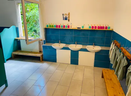 KINDERGARTEN "UNTER DEM REGENBOGEN"Seit Januar 2017 gibt es den Kindergarten "Unter dem Regenbogen" in der Heinrich-und-Thomas-Mann-Strasse inmitten der halleschen Innenstadt. Betreut werden die Kinder in zwei Kleinkindgruppen (1 bis 3 Jahre) und in zwei altersgemischten Gruppen (3 bis 6 Jahre). Die Besonderheit des Kindergartens sind die langen Waldtage, die auf dem Gelände der Ökologieschule Franzigmark verbracht werden. Eine Basisstation mit einem gemütlich hergerichteten Bauwagen bietet den Kindergruppen Schutz und die Möglichkeit, auch im Wald zu kochen und Mittagsruhe zu halten.